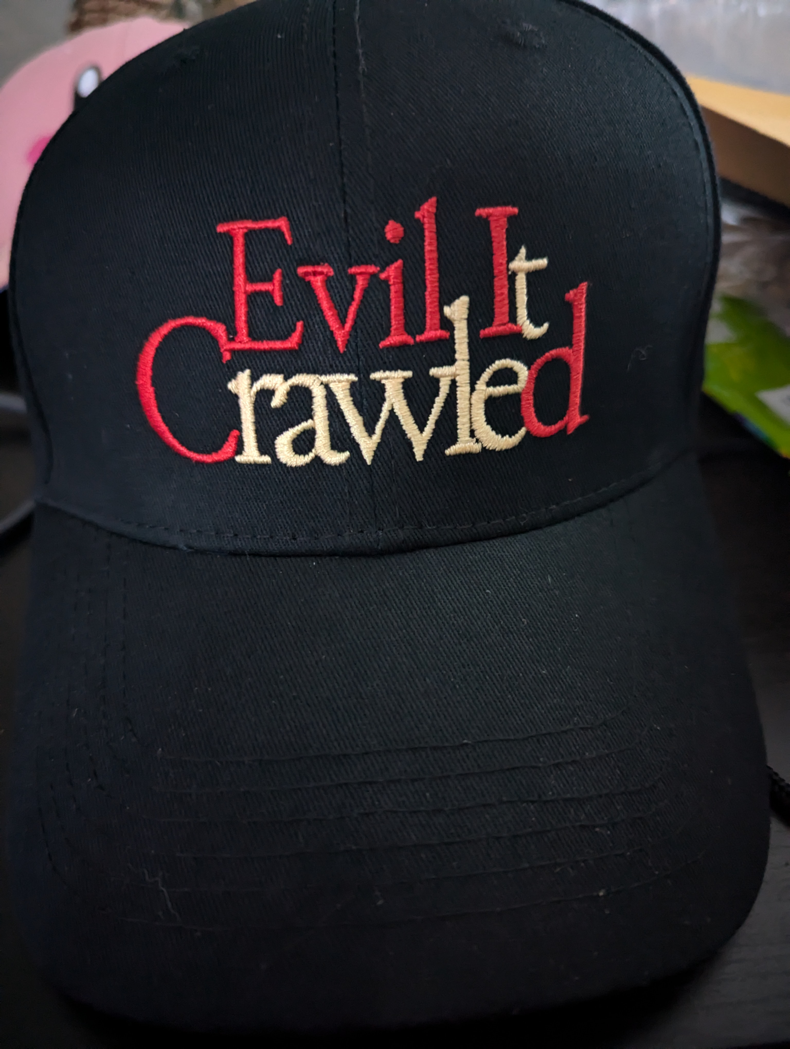 A black hat with the “Evil, It Crawled” logo embroidered on it.